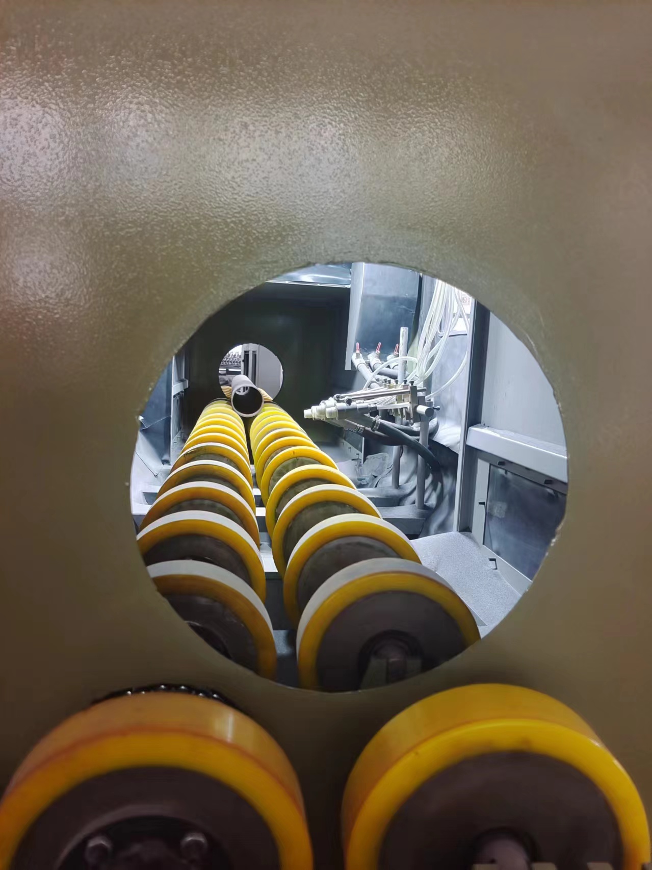 2、 本機(jī)采用輥軸旋轉(zhuǎn)帶動(dòng)產(chǎn)品螺旋前進(jìn)電機(jī)變頻調(diào)速,控制加工速率;噴槍組